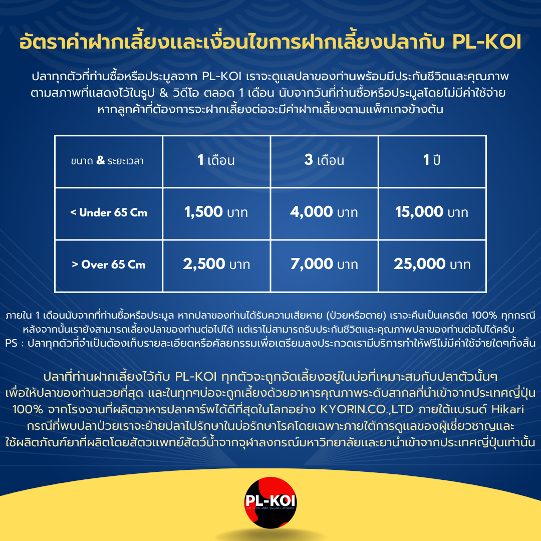 6. การฝากปลา : ปลาทุกตัวที่ท่านซื้อหรือประมูลจาก PL-KOI เราจะดูแลปลาของท่านพร้อมมีประกันชีวิตและคุณภาพ ตามสภาพที่แสดงไว้ในรูป & วิดีโอ ภายใน 1 เดือนนับจากวันที่ท่านซื้อหรือประมูล หากปลาของท่านได้รับความเสียหาย (ป่วยหรือตาย) เราจะคืนเป็นเครดิต 100% ทุกกรณี หลังจากนั้นเรายังสามารถเลี้ยงปลาของท่านต่อไปได้ แต่เราไม่สามารถรับประกันชีวิตและคุณภาพปลาของท่านต่อไปได้เเละจะมีค่าบริการฝากเลี้ยงครับ